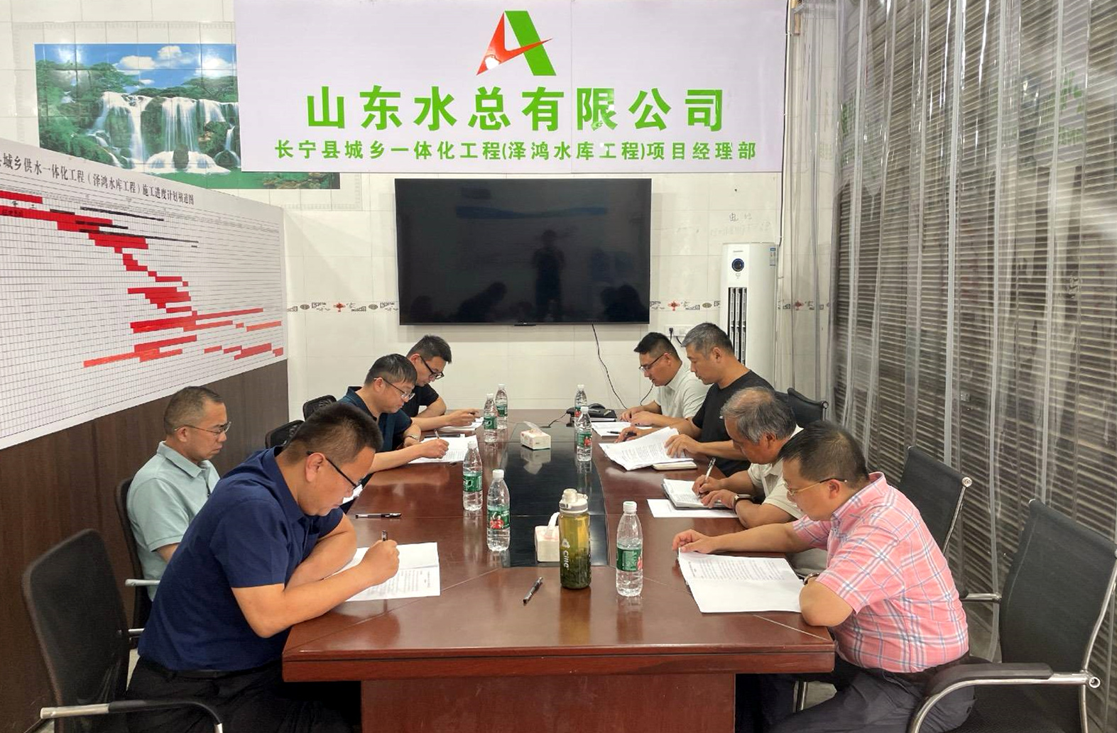 袁英杰一行深入项目施工现场,实地考察工程概况与目前进展情况。随后会议上,项目负责人就工程进度、营收计划、招标采购情况以及存在问题等方面进行了详细汇报。袁英杰指出,各在建项目要严格控制工程进度,保证各时间节点目标顺利达成,同时着重强调项目必须做好安全、质量、防汛工作。针对项目现存问题,与会人员进行了深入探讨,检查组提出切实可行的指导意见,并要求项目部及时完善收集变更索赔资料。